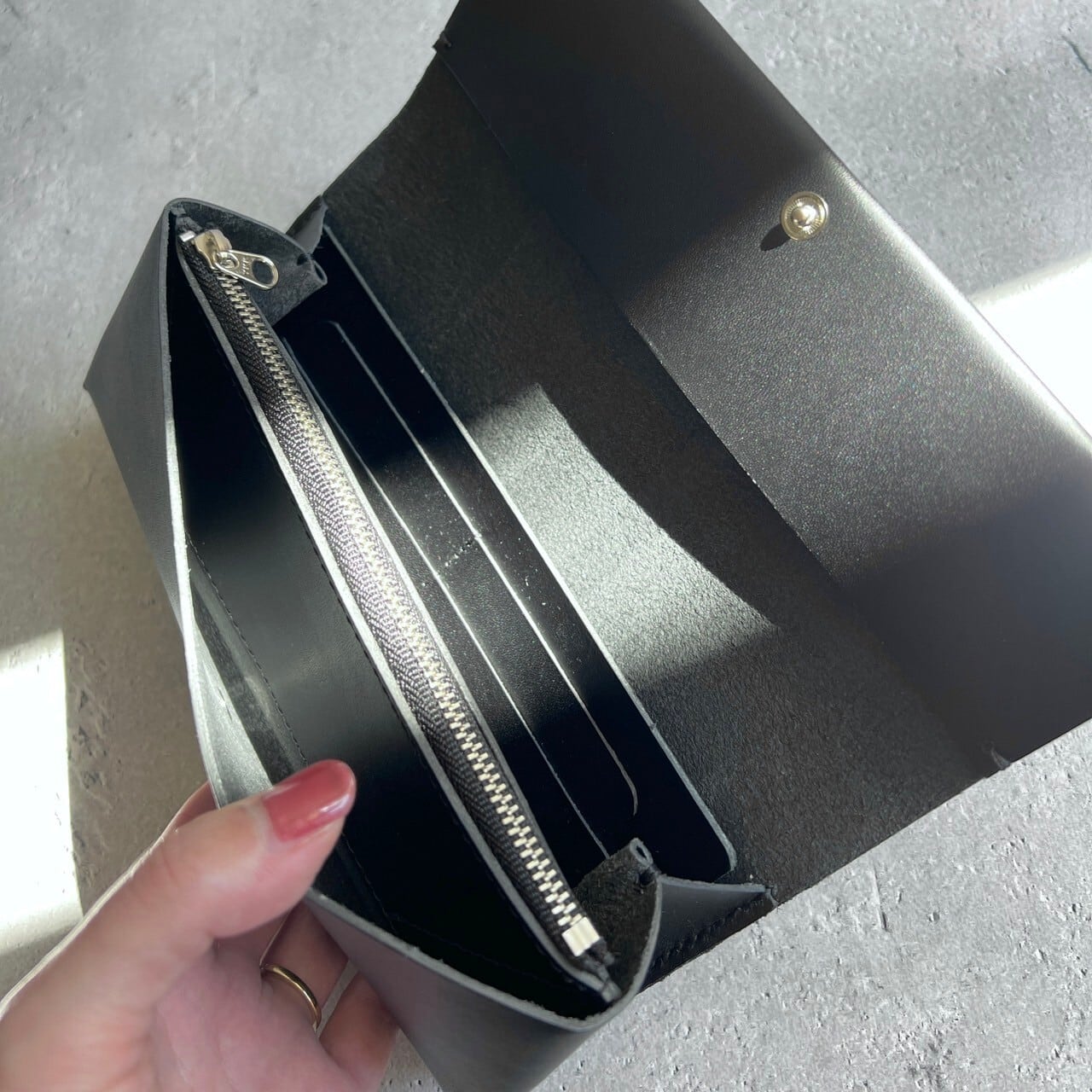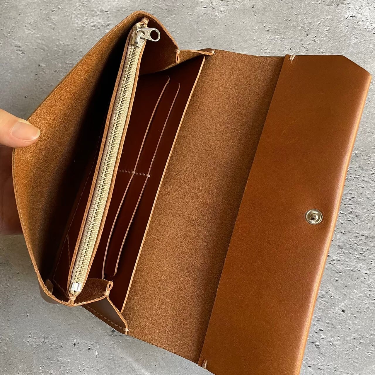 futuroの職人がハンドメイドした折り畳み式長財布。