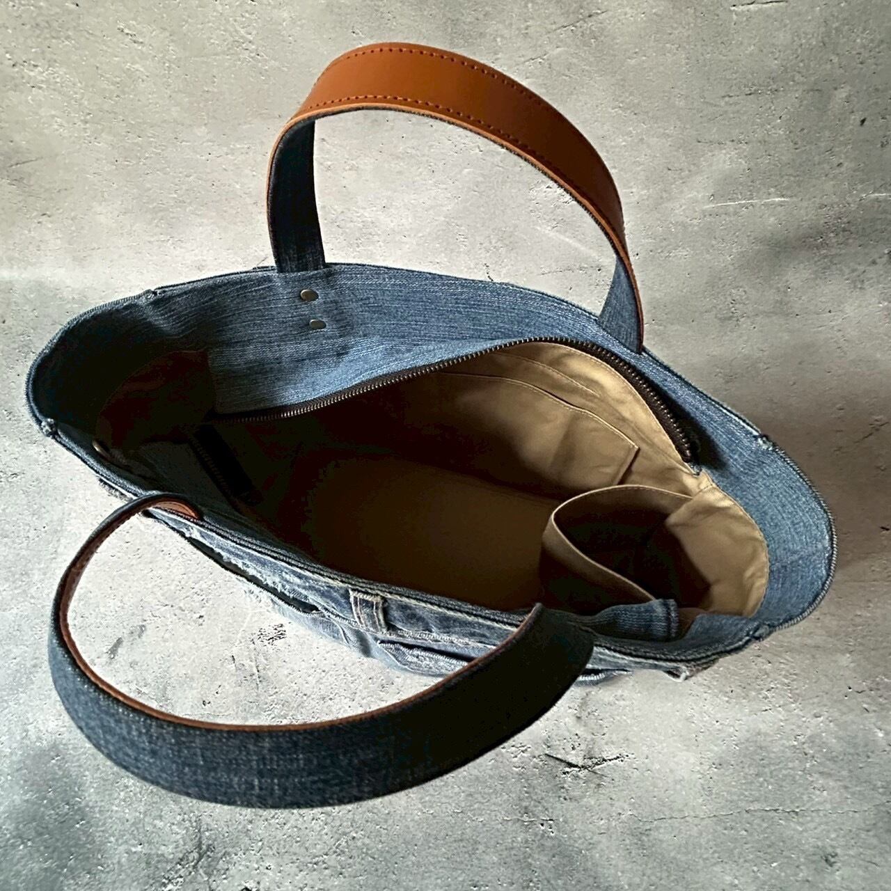本革とデニムを組み合わせたカジュアルなデザイン。