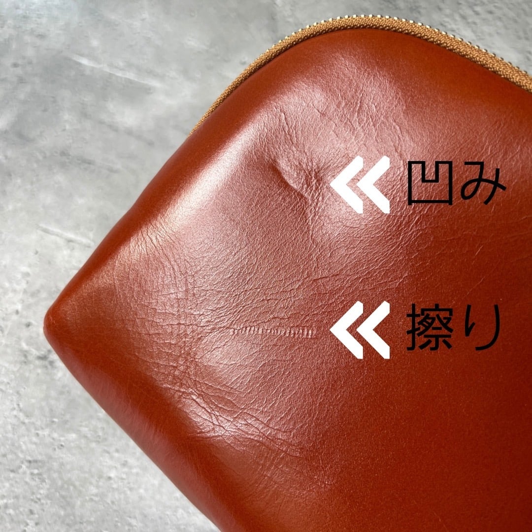 シワや凹み、擦り傷などがございますが、仕様上には問題ありません。また、ものによってシワの付き方などは異なりますので、革の味として楽しんでいただければと思います。